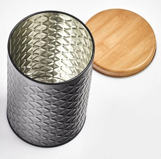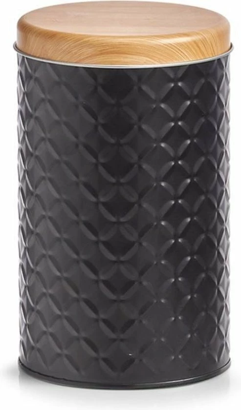 Een zwart bewaar/voorraad blik voor bijvoorbeeld snoep, koek en suiker. De deksel is lucht/geurdicht, waardoor de inhoud vers en vochtvrij blijft. De trommel heeft een houtlook deksel.