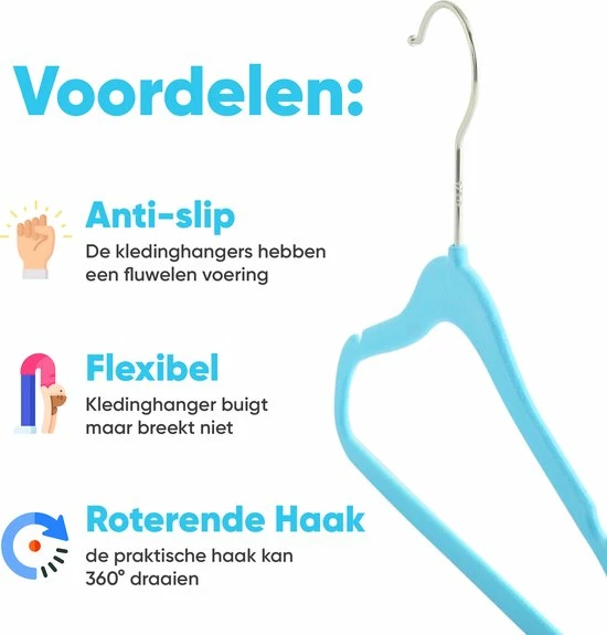 β Anti-Slip: de kledinghangers hebben een fluwelen voering. Hierdoor zal de kledij blijven hangen en niet van de kledinghanger afglijden.