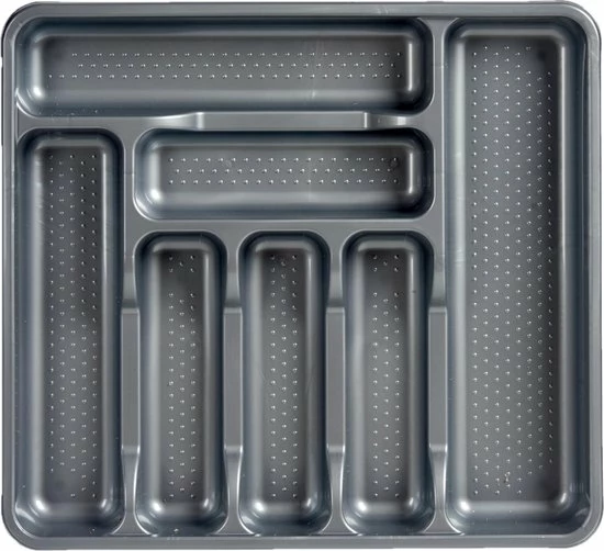 Bestekbak/bestekhouder 7-vaks grijs. Formaat: 42 x 39 x 4,5 cm. Materiaal: kunststof. Keukenlade/besteklade inzetbak.