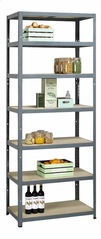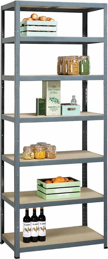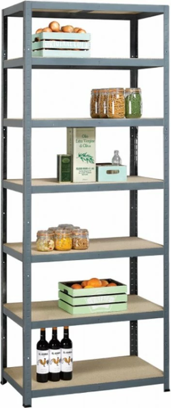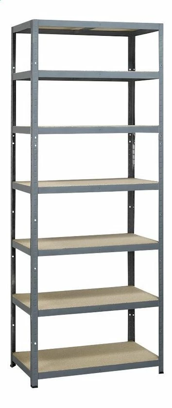 Hoogwaardig gegalvaniseerd stalen Tower L opbergrek van Avasco met 7 verstelbare legplanken met een draagvermogen van 200 kg per legplank.