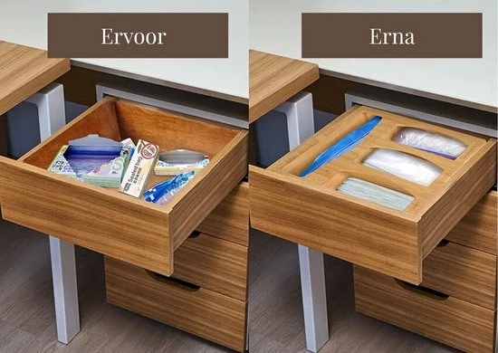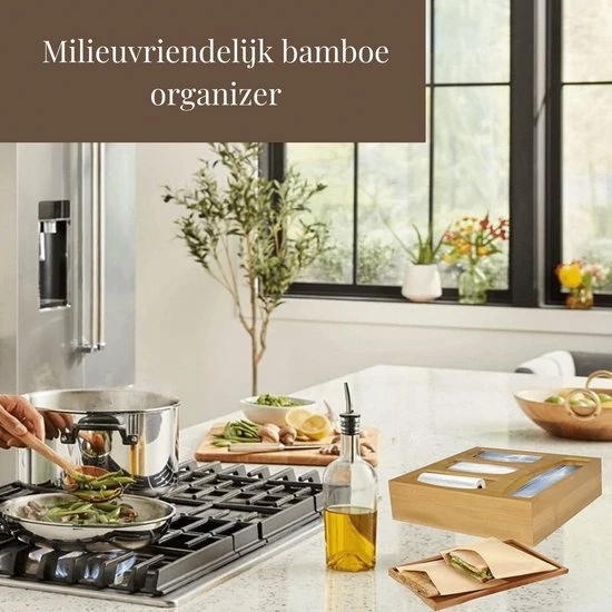 Heb jij ook een rommelige keukenlade waarin het overzicht ontbreekt? Ben je altijd op zoek naar dat ene rolletje boterhamzakjes ergens achter in de lade? Met deze handige BY JRM bamboo boterhamzakjes organizer, speciaal bedoeld voor het opbergen van verschillende soorten plastic zakjes, is dat verleden tijd. Je ziet namelijk in één oogopslag welk zakje je nodig hebt, met als bijkomend voordeel een opgeruimde en overzichtelijke keukenlade.