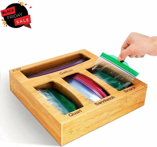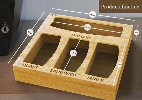 De bamboo boterhamzakjes organizer BY JRM heeft vier compartimenten waarvan een extra groot compartiment voor een groot formaat zak. De ruime afmeting van 30,5 x 30,5 x 7,5 centimeter biedt daarmee ruim voldoende plek aan vier verschillende soorten plastic zakjes. De compartimenten zijn zo ontworpen dat ze geschikt zijn voor de meeste standaard maten opbergzakjes.