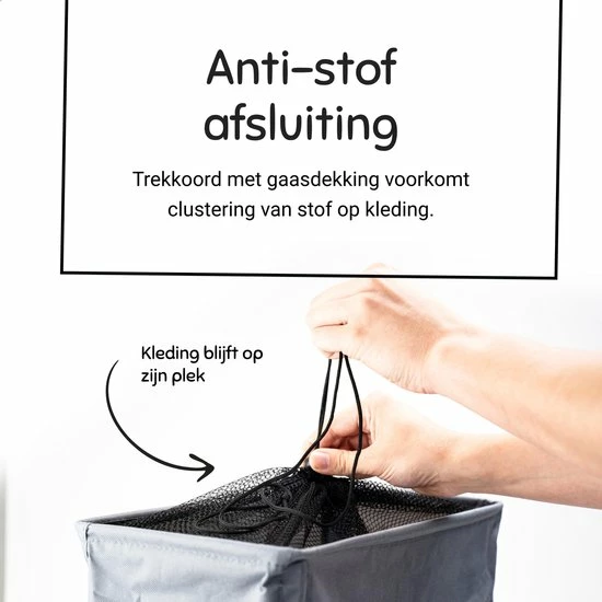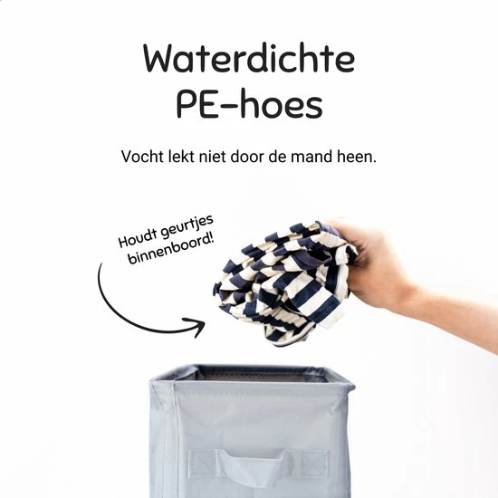 Met een binnenvoering van waterdicht PE lekt vocht niet door de mand heen, en worden geurtjes binnenboord gehouden. Het trekkoord met gaasdekking voorkomt clustering van stof op kleding: zo sluit je in 1 hijs de wasbox af.