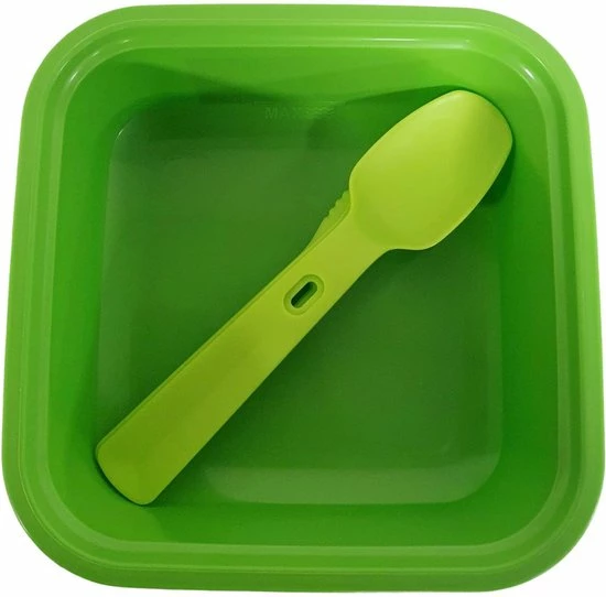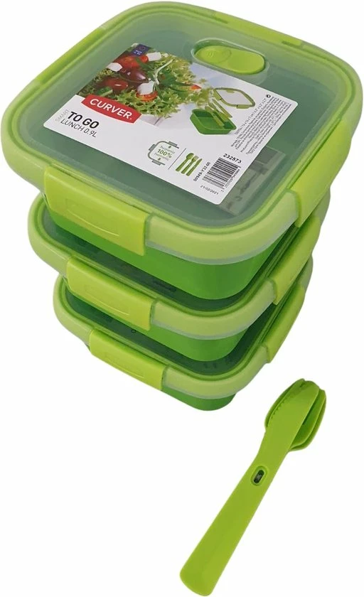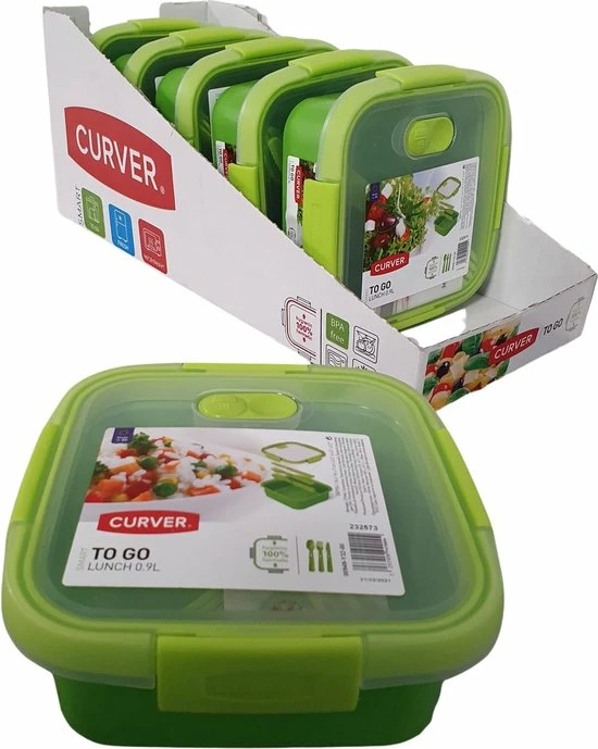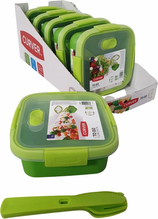 Ieder bakje wordt geleverd met een vork, lepel en een mes.