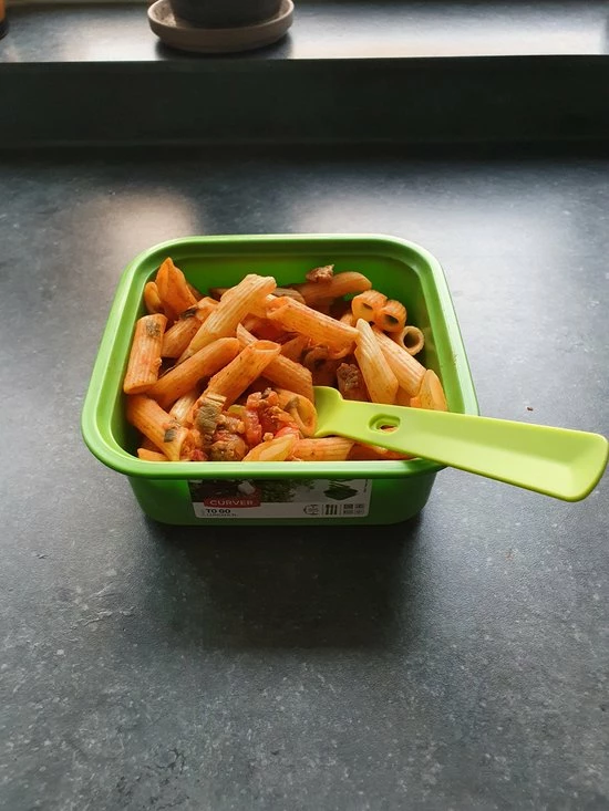 Het bestek is in elkaar te klikken en past diagonaal precies in het bakje. Erg handig voor onderweg!