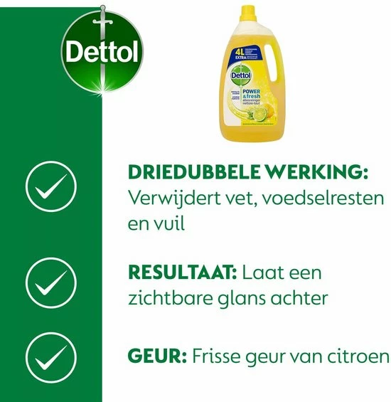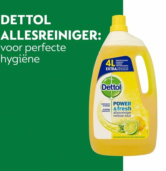 Dettol Power & Fresh Allesreiniger zorgt voor een perfecte hygiΓ«ne in het hele huis. De driedubbele werking verwijdert gemakkelijk vet, voedselresten en vuil. Dettol schoonmaakmiddel is geschikt voor alle harde en afneembare oppervlakken. Het laat een zichtbare glans achter en verfrist elke ruimte met de heerlijke geur van citrus.