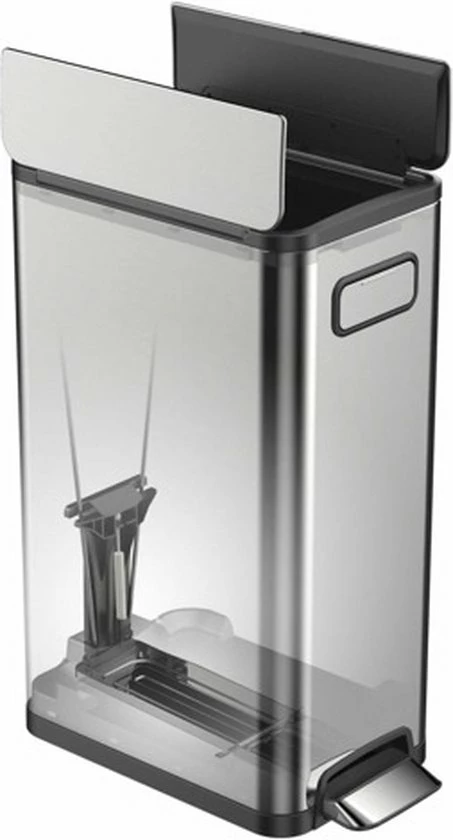 De matzilverkleurige Ecofly pedaalemmer heeft een inhoud van 45 L en een strakke binnenbak.