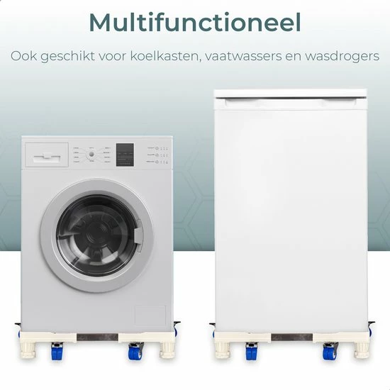 Echter is het nog niet voorbij met de pret. Deze nieuwe versie is naast de verstelbare pootjes ook nog eens voorzien van wieltjes. Hiermee kun je eenvoudig je wasmachine, vaatwasser of koelkast verplaatsen.
