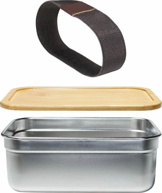RVS en bamboe zijn erg goede materialen voor opbergers. Roestvrij staal is stevig en kan goed schoongemaakt worden. Vaak is even afspoelen met wat mild afwasmiddel al voldoende. Het bamboe deksel is een duurzame keuze en sluit de broodtrommel goed af. Omdat je natuurlijk niet het risico wil lopen dat je lunch door je hele tas ligt, zit er ook nog een stevig elastiek om de trommel heen. Zo blijft je eten lekker vers รฉn hoef je niet bang te zijn dat je jouw lekkere boterham of salade straks onderin je tas terugvindt.