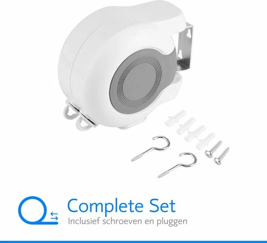 Download de handleiding onder de afbeeldingen of gebruik de papieren versie in de verpakking voor hulp bij het monteren van de oprolbare drooglijn.