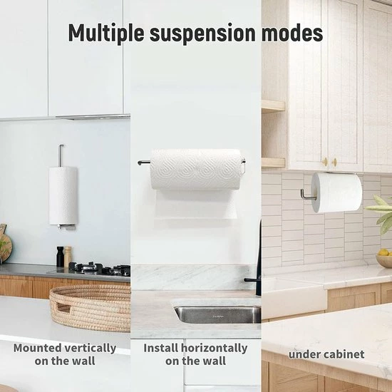 - Flexibele Ophangmethode: Gebruik de ruimte onder de keukenkast om het keukenrolhouder op te hangen, dat verticaal of horizontaal kan worden geΓ―nstalleerd, waardoor opslagruimte in de keuken wordt bespaard. De zelfklevende keukenwandrolhouder kan de keukenhygiΓ«ne garanderen om gemorste materialen te verwijderen of vuil weg te vegen.