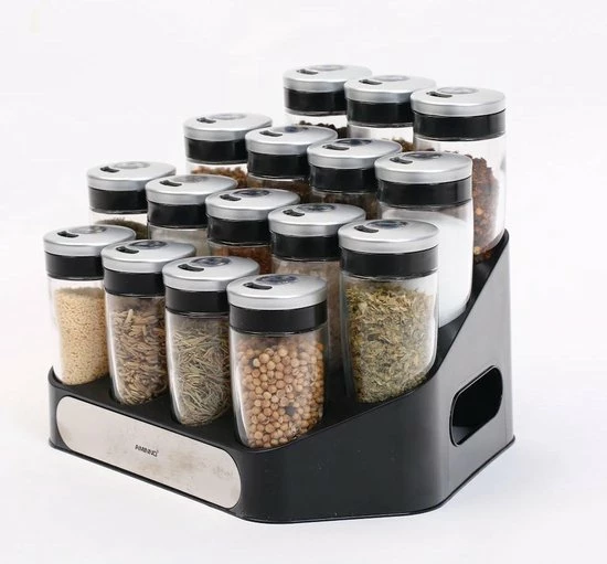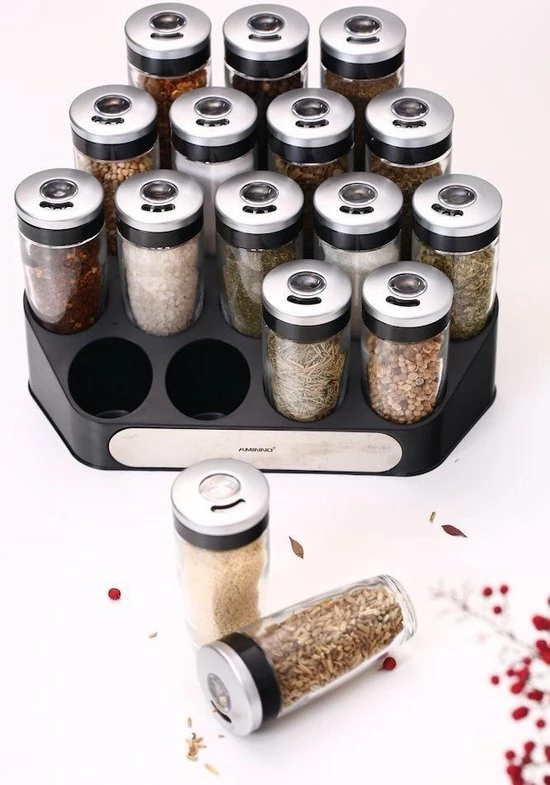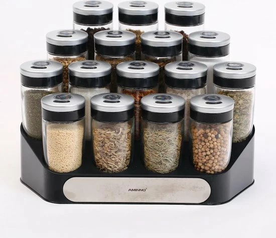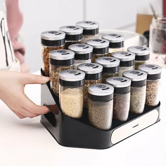 Met dit luxe kruidenrek heb je al je kruiden, specerijen, curry, zout, peper etc. altijd binnen handbereik bij het koken. Dit kruiden rek biedt met 16 glazen potjes ruimte voor verschillende soorten kruiden en specerijen. Om ervoor te zorgen dat de kruiden zijn aroma en smaak behoudt, zijn deze luchtdicht met een schroefdeksel afgesloten. Alle kruidenpotjes zijn voorzien van een strooier.