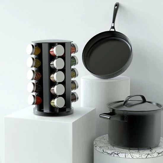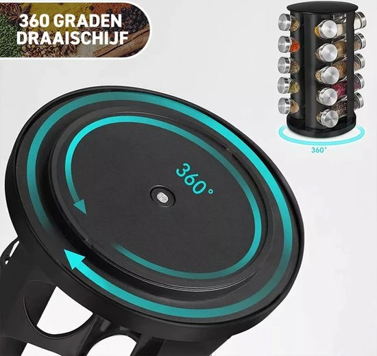 Alle kruiden binnen handbereik en meer ruimte in de keuken creëren? Dan ben je hier aan het juiste adres. Dit draaibare kruidenrek biedt ruimte voor 20 verschillende kruiden en specerijen. Ook kan je alle kruiden en specerijen gemakkelijk pakken doordat het kruidenrek 360°draaibaar is. Het kruidenrek word geleverd inclusief de bijbehorende glazen kruidenpotjes, stickers en een stift. Zo kan jij je favoriete kruiden en specerijen voorzien van de juiste benaming en staat alles netjes geordend in je keuken!