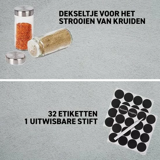 Iedereen kent het wel, zo’n kruidenkastje of lade die overvol zijn door alle verschillende kruidenpotjes, die er door elkaar in staan/liggen. Met dit kruidenrek is dat verleden tijd. Het is voorzien van 20 glazen kruidenpotjes, 32 stickers zodat je elk kruid de juiste benaming kan geven, een uitwisbare stift en de bijbehorende strooiroosters.