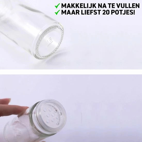 Je kunt eenvoudig de kruidenpotjes vullen naar keuzen. Alle potjes zijn voorzien van een strooideksel zo kan je altijd de juiste hoeveelheid kruiden aan het eten toevoegen. De dekseltjes van de glazen potjes zijn gemakkelijk te openen en zijn zeer stevig. Dit nieuwe model is voorzien van een ronde afwerking, wat het design erg stijlvol maakt.