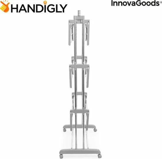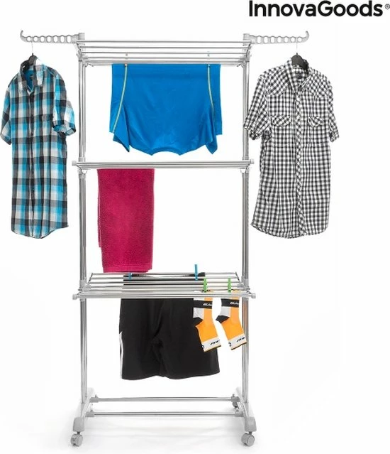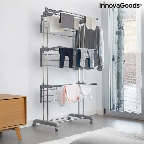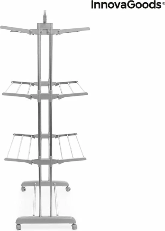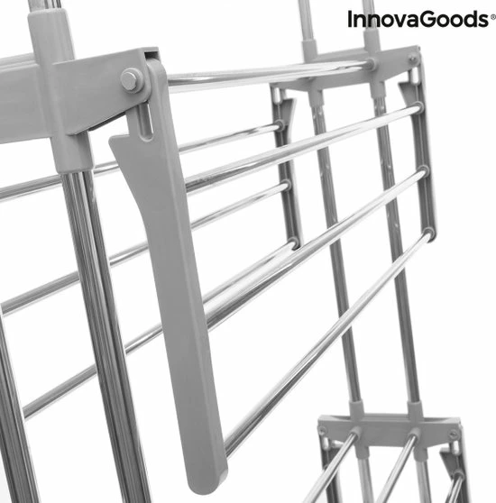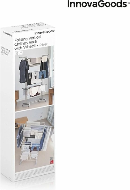 Het Folver InnovaGoods inklapbare verticale kledingdroogrek op wielen is een handig, praktisch en draagbaar kledingdroogrek met een grote capaciteit en een goede stabiliteit. Het bestaat uit 24 metalen stangen, die gelijk staan aan 17 meter waslijn, waaraan u allerlei soorten kleding kunt ophangen. Zijn vertical en inklapbare ontwerp zorgen voor maximal gebruik en maken hem ruimtebesparend tijdens gebruik en bij het opbergen. Dit verticale kledingdroogrek heeft ook 2 haken voor jashangers waaraan meer delicate kledingstukken kunnen worden opgehangen met optimale resultaten zonder hangsporen of kreuken. Hij heeft tevens 4 wielen waarmee u hem makkelijk kunt verplaatsen naar daar waar u hem nodig heeft.