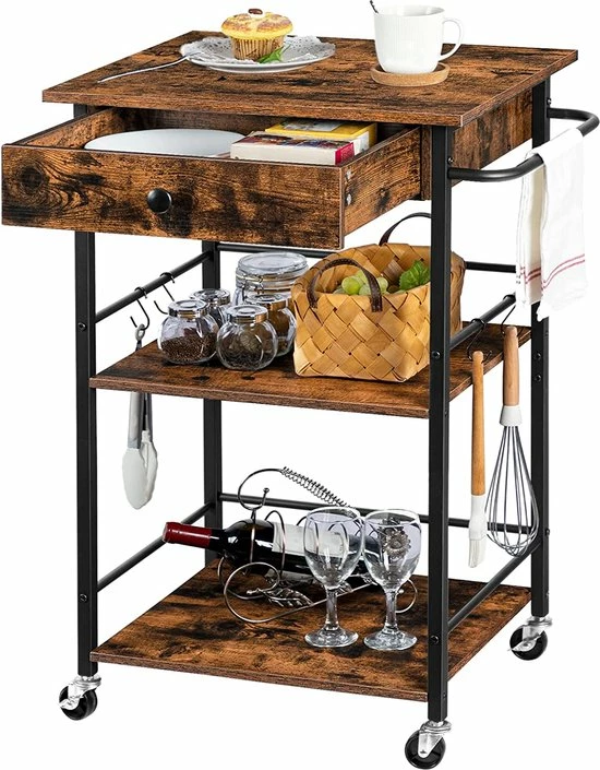 VEELZIJDIG DESIGN – Deze keukentrolley: 56 x 46 x 89 cm. Uittrekbare lades voor messen, vorken en borden houden je keuken netjes en schoon. Dubbele planken met leuning zodat er niets uit kan vallen, duwhandvatten voor handdoeken en schorten en 4 haken om kleine spullen op te hangen.