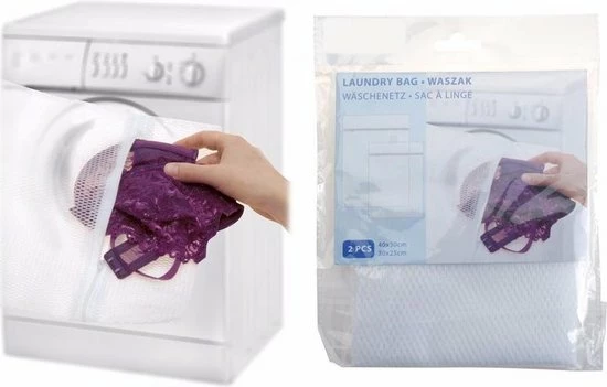 Waszakken setje voor in de wasmachine. Met deze zakken kunt u kwetsbare kleding beschermen tegen beschadigingen door de wasmachine. Het setje bestaat uit 2 verschillende zakken. Afmetingen: 40 x 30 cm en 30 x 25 cm. Materiaal: polyester. U ontvangt 4 waszakken.