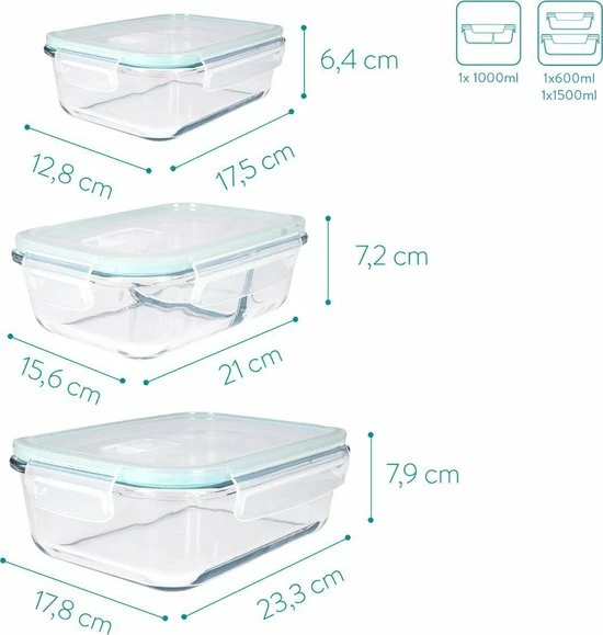 - SET VAN 3: Je ontvangt drie vershoudbakjes in verschillende maten, namelijk 600ml, 1000 ml en 1500ml. Of je nu een grote of kleine maaltijd wilt bewaren, je hebt altijd een passende bak. Het bakje van 1000ml heeft een handige vakverdeling.