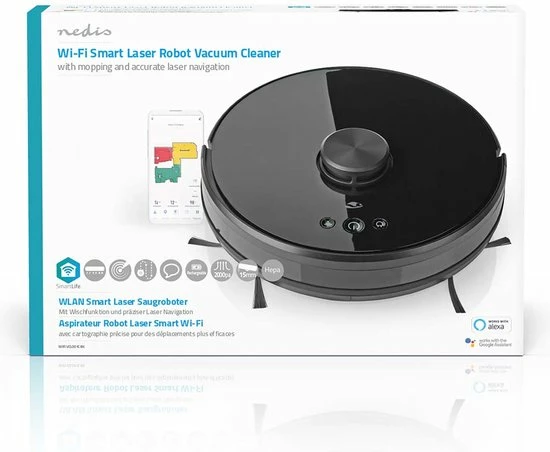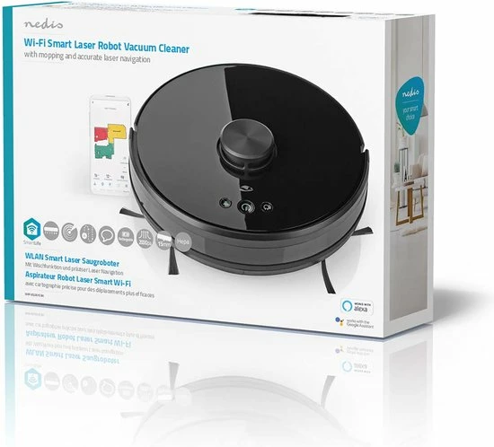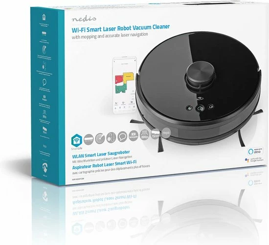 Deze 3-in-1 Smart Wi-Fi-robotstofzuiger kan je huis vegen, stofzuigen en dweilen terwijl jij iets anders doet, of zelfs wanneer je niet thuis bent. Sluit het apparaat aan op je Wi-Fi thuis en bedien het via de Nedis SmartLife-app (iOS en Android), de afstandsbediening of de knoppen op de robot zelf. Hij ondersteunt ook spraakbediening met Alexa en Google Assistant.