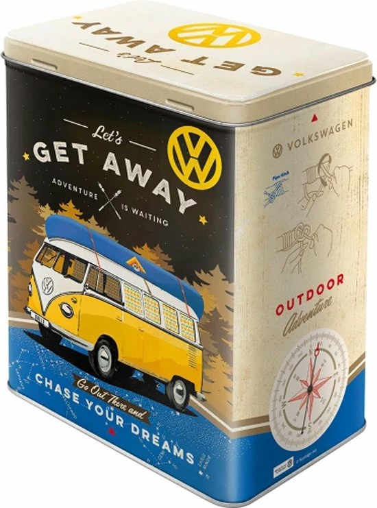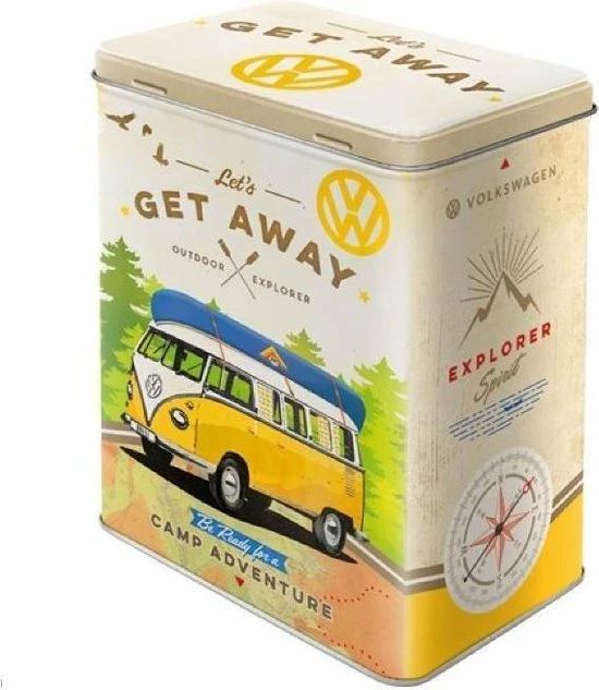 Kleurrijk bewaarblik met klikdeksel. Het blik is afgebeeld met een gele Volkswagen T1 bus afgebeeld. Het blik is niet luchtdicht dus niet aangeraden voor voedingsmiddelen.
