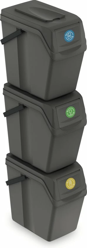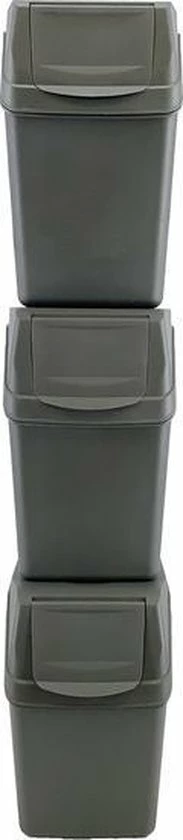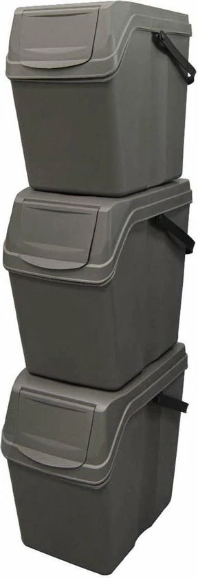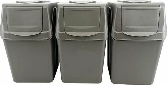 Set van 3 stuks kunststof afvalscheidingsbakken grijs, stapelbaar. Inhoud: 3x 25 liter. Formaat per afvalbak: lengte: 40 cm. breedte: 24 cm Hoogte: 40 cm. Inclusief handige kleuren stickers welke verwijzen naar het soort afval voor in de prullenbak.