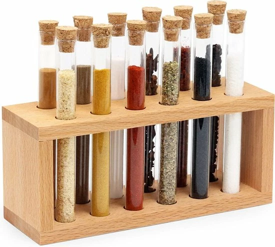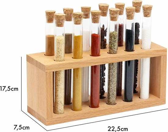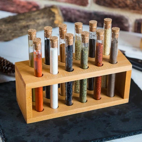 Dit stijlvolle reageerbuisjes kruidenrek op houten staander is het nieuwe kruidenrek van het jaar! De houten standaard bied ruimte voor 12 stijlvolle reageerbuisjes met kurk voor het organiseren van jouw favorieten kruiden. Een echte must have voor iedere kook liefhebber!