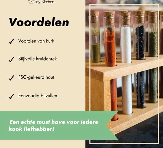 Stijlvol design: Decoratief houten kruidenrek met glazen reageerbuisjes inclusief afneembare kurken dop. Zeer praktisch om onder andere peper, zout, vanille of andere fijne kruiden in te bewaren. De inhoud van elk kruidenpotje blijft lekker vers dankzij de luchtdichte afsluiting. Daarnaast zijn de potjes bij het wisselen van eventueel nieuwe kruiden eenvoudig te reinigen.