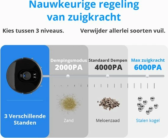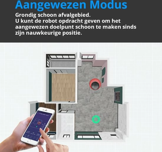 6 Reinigingsmodi – De robotstofzuiger ondersteunt 6 reinigingsmodi, waaronder automatische reiniging, max. stofzuigen, rand reiniging, willekeurige reiniging, gebieds reiniging en dieptereiniging. Schakel naar wens vrij tussen verschillende modi en vermogensniveaus.