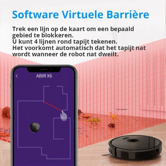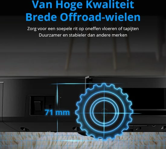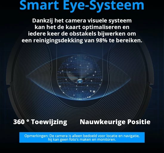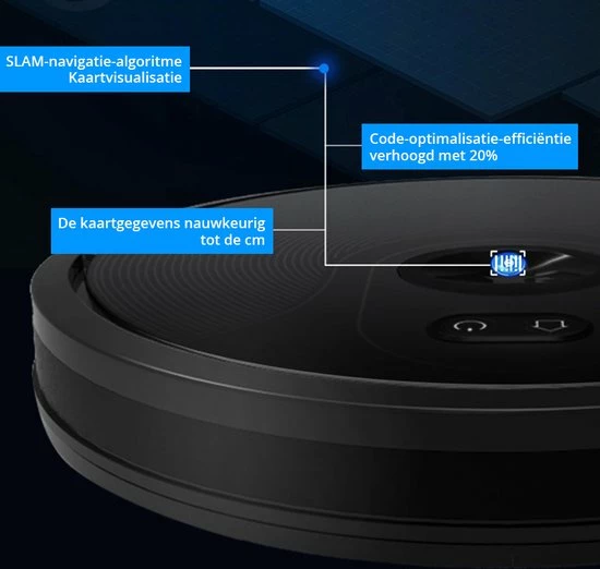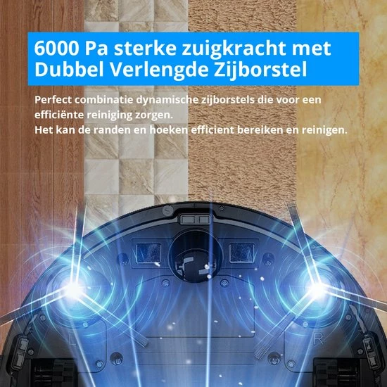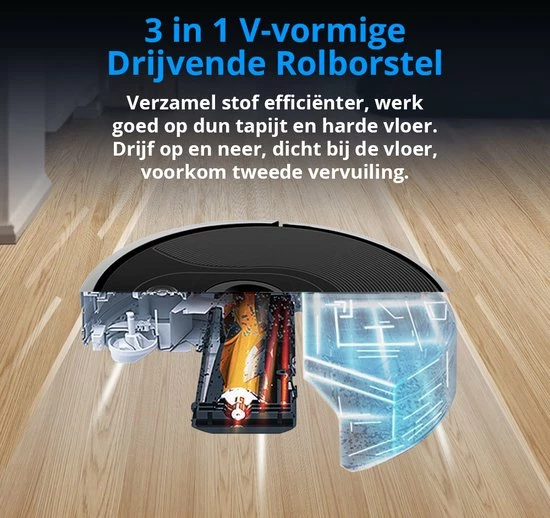 Schone Randen – Zeer efficiรซnte reiniging, realtime locatie van de camera door honderden verschillende objecten. Reinig randen en hoeken met reiniging van rand tot rand. Draaibare besturing voor eenvoudig manoeuvreren rond meubels en andere obstakels.