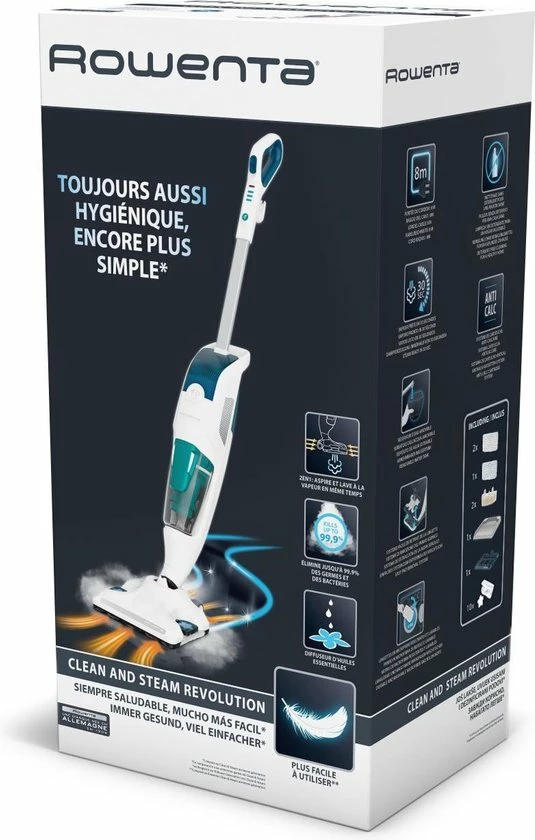De Rowenta Clean & Steam Revolution RY7757 – Vloerreiniger combineert innovatieve schoonmaaktechnologie met een gebruiksvriendelijk ontwerp en biedt daarmee makkelijk schoonmaken in een licht en compact apparaat. Een brandschoon en gezond huis is nu makkelijker dan voorheen* met weergaloze prestaties en tijdbesparende efficiΓ«ntie in één beweging. Deze vloerreiniger stofzuigt en stoomt alle vloeren tegelijkertijd, in één beweging met stoomkracht die de vloer reinigt en verfrist tijdens het schoonmaken. De toevoeging van een diffuser voor olie maakt de schoonmaakervaring van je huis nog beter met een extra stukje wellness. Dit innovatieve apparaat maakt stoom van kraanwater, en heeft een reeks aan extra functies, inclusief geavanceerde cycloontechnologie voor langdurige resultaten en een uitneembaar waterreservoir voor makkelijker bijvullen. Hierdoor biedt het een schoonmaakoplossing in één beweging. *vs Clean & Steam vorige generatie