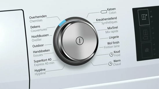 - TouchControl tiptoetsen: Voorzichtig, Signaal, Start/Pauze, Droogtegraad, Kinderslot 3 sec., “Antikreuk 60min”, “Antikreuk 120min”, myFavorite, 24 u eindtijduitstel