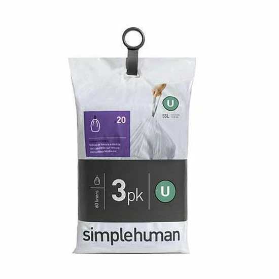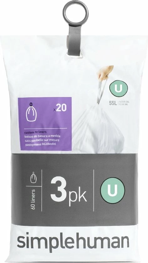 Afvalzakken voor Liner Pocket afvalemmers van Simplehuman. Code U / 55 liter / Set van 3×20 stuks. Alle afvalzakken opgeborgen in de afvalemmer en altijd bij de hand wanneer de volle afvalzak gewisseld dient te worden. Deze afvalzakken uit de Liner Pocket serie met code U zijn geschikt zijn voor alle soorten afvalemmers met een inhoud van circa 55 liter. De afvalzakken passen ook in kleinere prullenbakken.