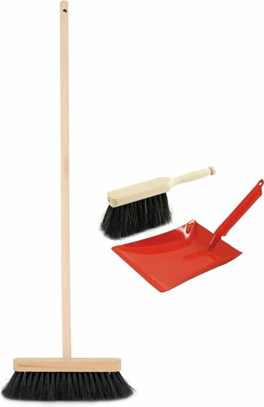 Speelgoed schoonmaak set. De set is inclusief een stoffer met zachte zwarte kunststof haren, een rood metalen stofblik en een binnen bezem. Materiaal stoffer: hout/kunststof. Materiaal stofblik: metaal. Materiaal bezem: hout/paardenhaar, formaat ca. 17 x 65 cm. bestaande uit 1x Kamer kinderbezem zwart met steel 65 cm, 1x Kinderstoffer/handveger met houten handvat, 1x Kinder stofblik rood van metaal 13 x 10 cm.