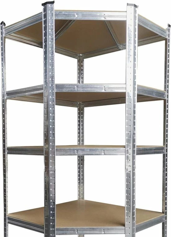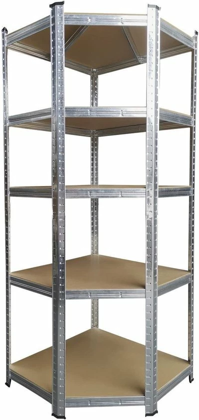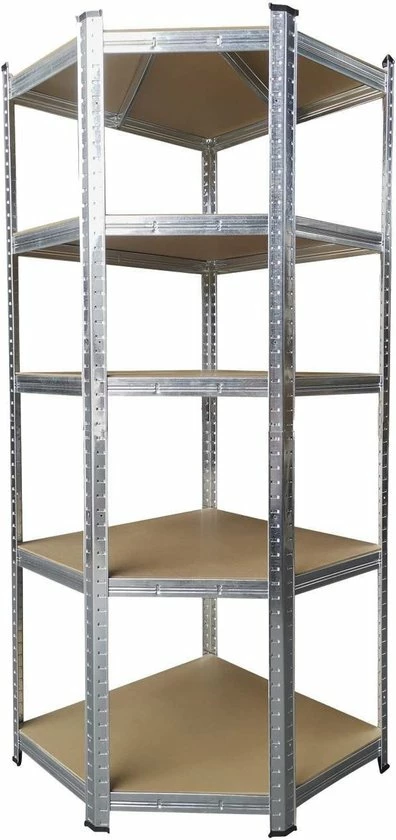 Deze rekken voor zwaar gebruik zijn speciaal gemaakt voor hoeken en bieden een draagvermogen tot 875 kg met vijf verstelbare legborden. Het gegalvaniseerde stalen frame bevat vijf niveaus van MDF-planken, met elk een draagvermogen van 175 kg en is geschikt voor het opslaan van zware producten voor magazijnen, werkplaatsen, enz.