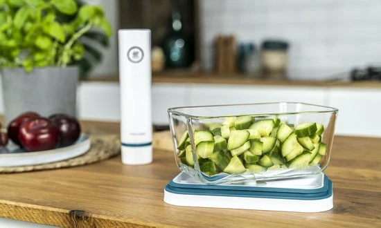 DΓ© trend van het moment? ‘Meal prepping’! Dat betekent dat u alle ingrediΓ«nten koopt, de maaltijden bereidt, ze in de koelkast zet en er pas later van geniet β wanneer het u uitkomt. Dit bespaart een hoop tijd en stress. Maar hoe kunt u maaltijden vers en lekker houden? Heel eenvoudig: in de handige en elegant gevormde vacuΓΌmpot. Hierin blijft eten tot vijf keer langer vers in vergelijking met conventionele niet-vacuΓΌmbewaring. Dankzij de vacuΓΌmpomp worden alle belangrijke aroma’s en vitaminen in slechts enkele seconden optimaal behouden.