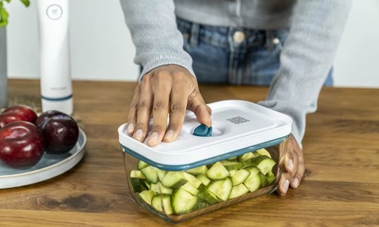 VacuΓΌmfunctie: levensmiddelen blijven tot vijf keer langer vers in vergelijking met conventionele niet-vacuΓΌmbewaring: aroma’s en voedingsstoffen worden optimaal vastgehouden en voedselverspilling wordt tegengegaan.
