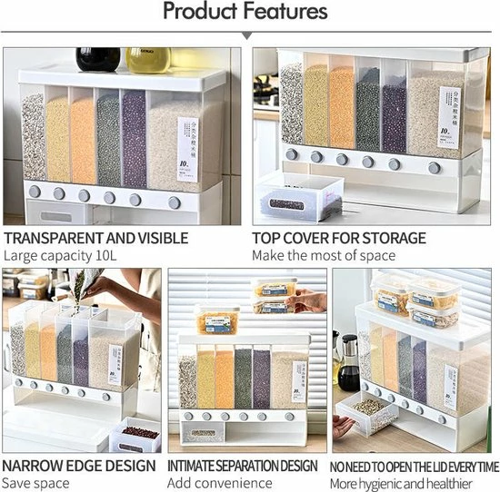 De Food Dispenser wordt geleverd met 6 verschillende containers. Dankzij de vocht bestendige materiaal worden jouw ingrediรซnten droog en luchtdicht bewaard wat jouw ingrediรซnten langer houdbaar maakt!